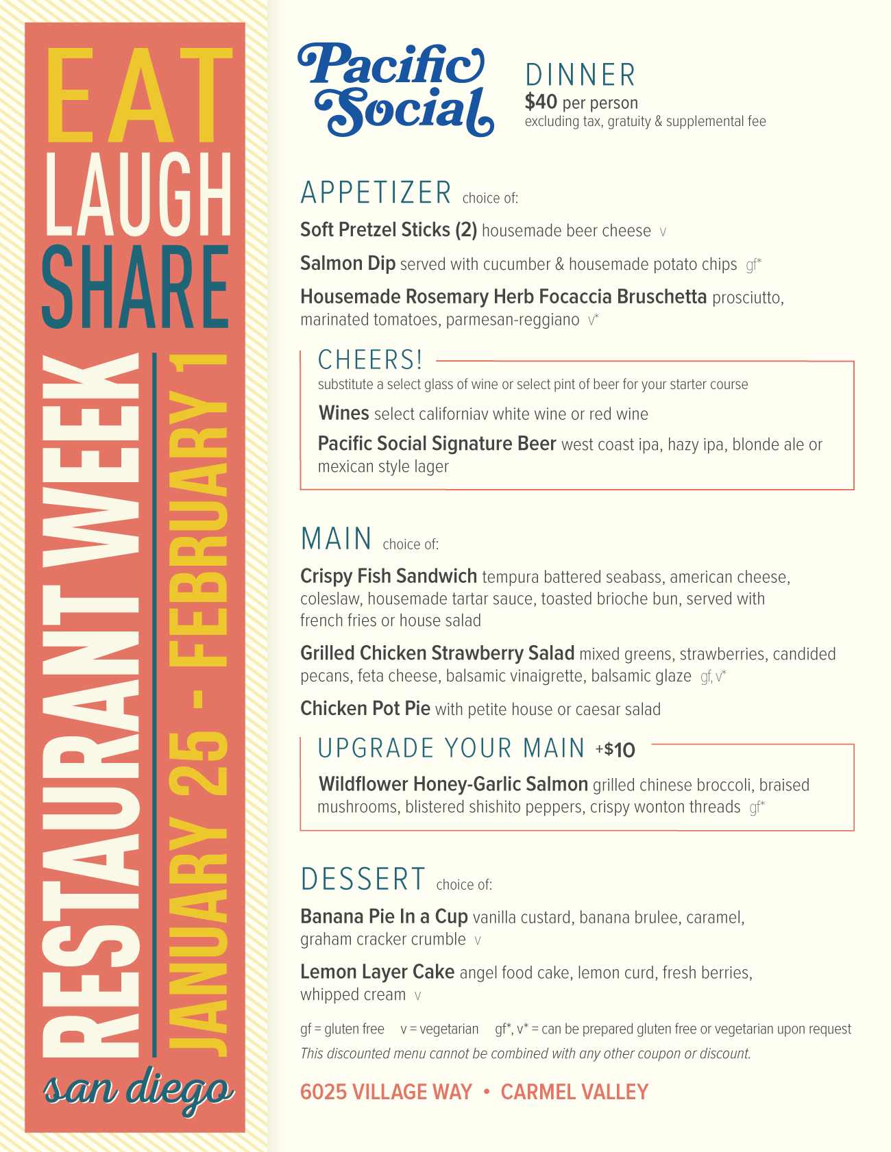 Looking for the perfect Sunday night date idea? We’ve got you covered at Pacific Social! Enjoy a cozy, romantic evening for just $70 per couple, excluding tax, gratuity and supplemental fees. Our offer includes: a bottle of wine, a delicious appetizer, two entrees, and a sweet dessert to finish off the night!